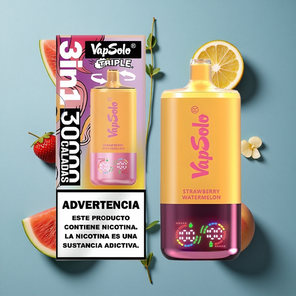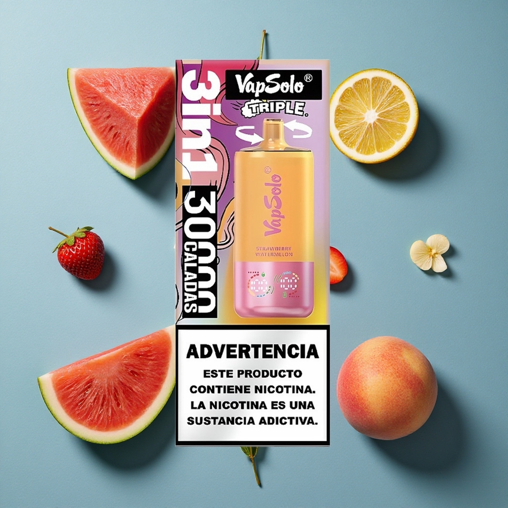 VapSolo Triple 30000 পাফস ডিসপোজেবল ভেপ স্ট্রবেরি তরমুজ ও লেবু পীচ ই-লিকুইড: ৪০মিলি নিকোটিন: ২০ মিগ্রা/মিলি, ৫০ মিগ্রা/মিলি